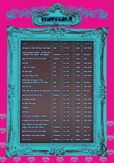 An eight page A5 booklet plus 6" x 4" postcard created for the celebration of Frank Zappa's life and music, which marked what would have been his 70th birthday, at London's Roundhouse on 5-7 November 2010.