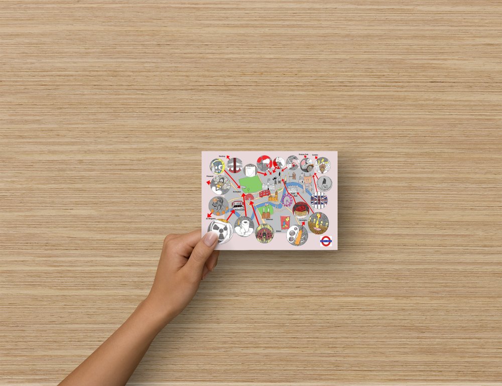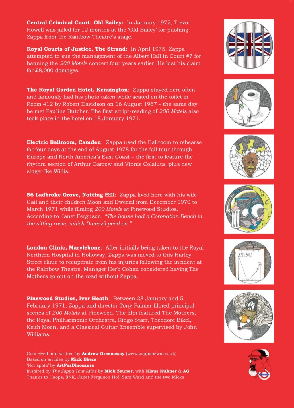 A beautifully illustrated four page 1000 word A5 booklet, plus A6 postcard, detailing 18 locations in the UK’s capital where Frank Zappa stayed, played and recorded.